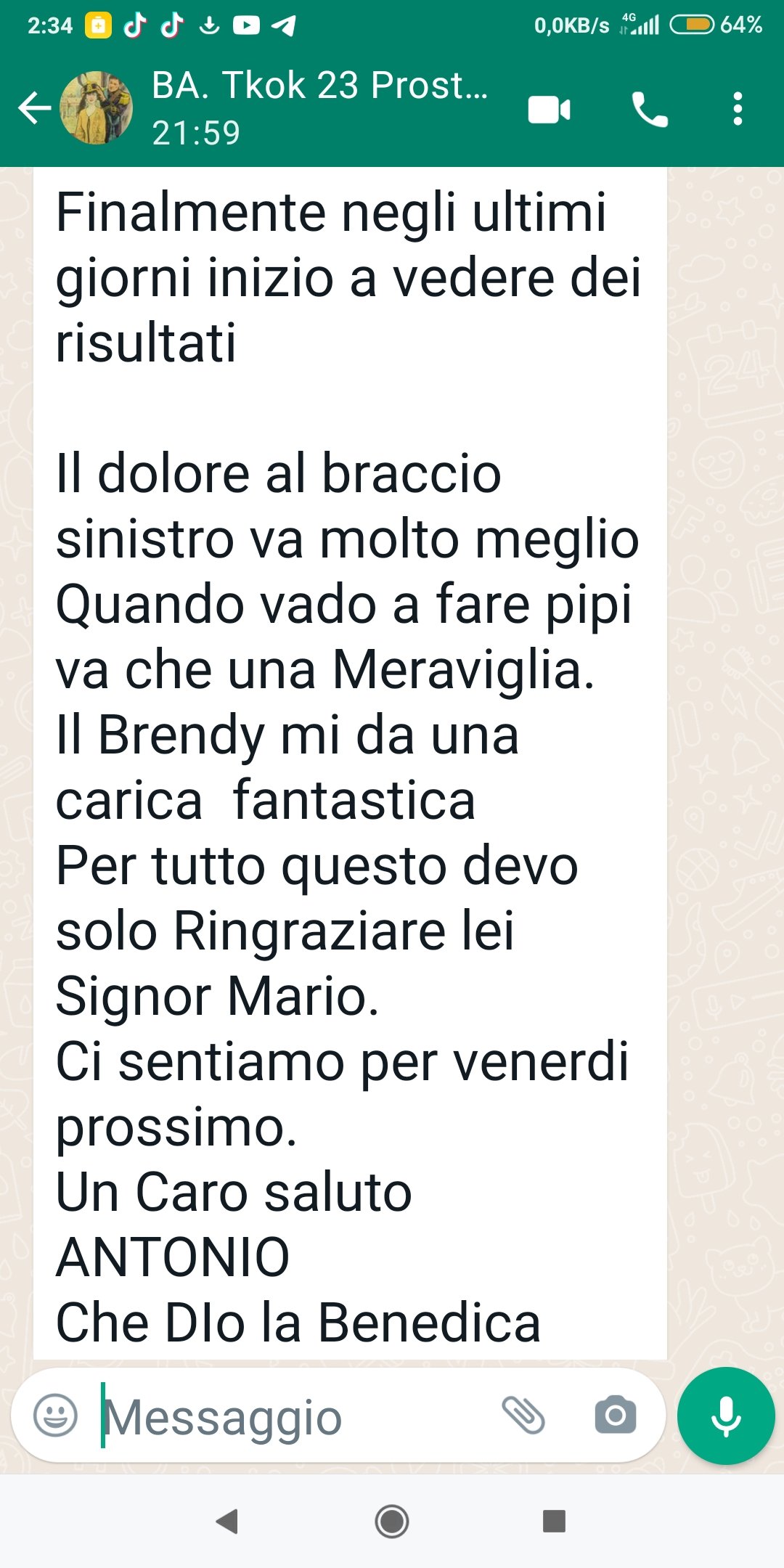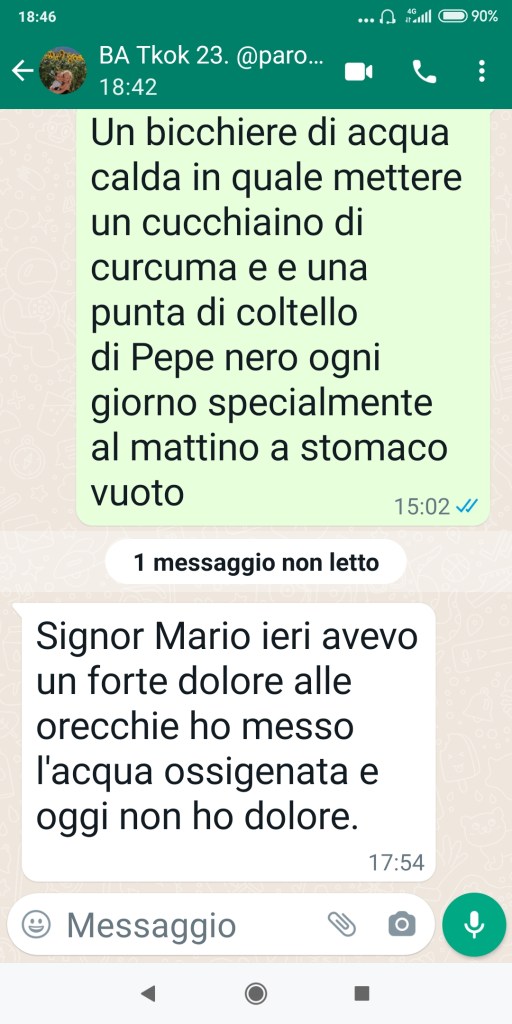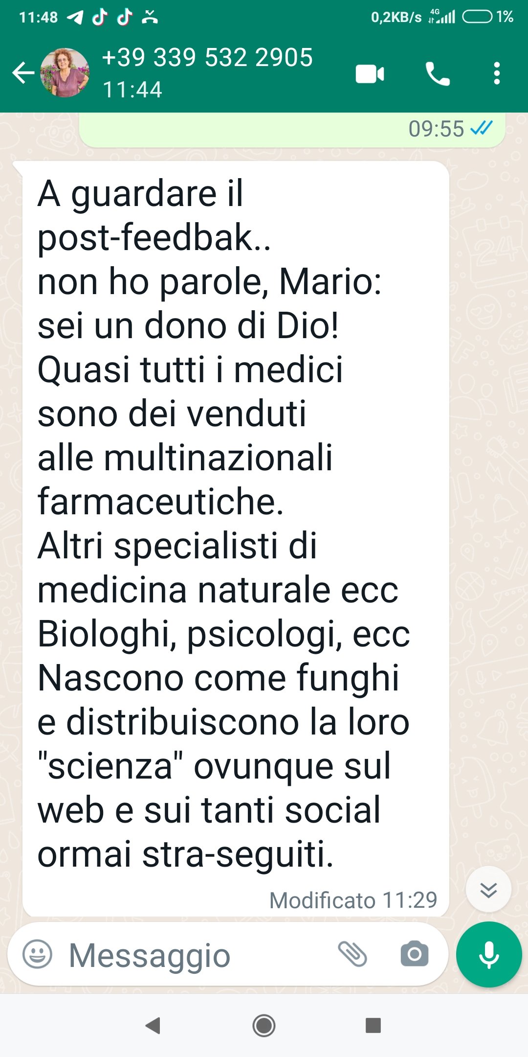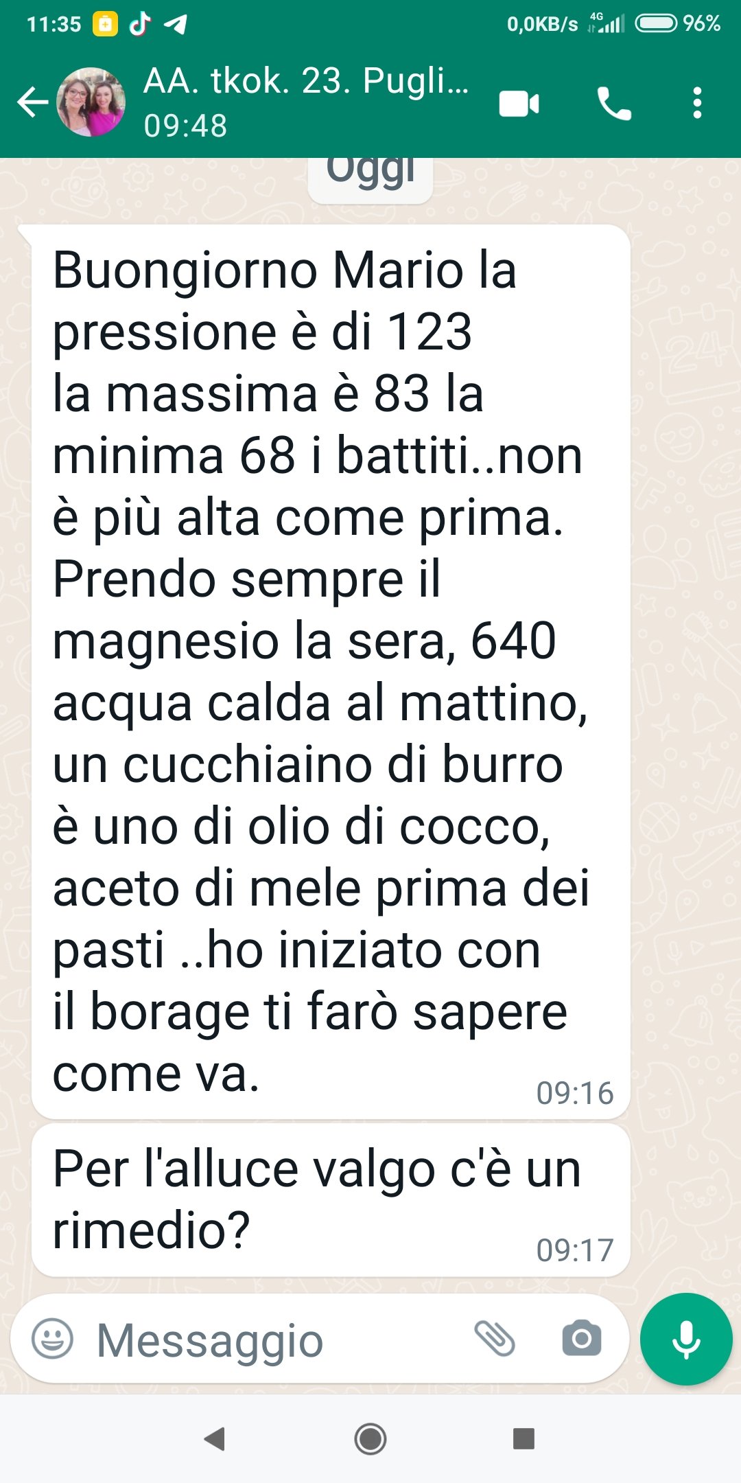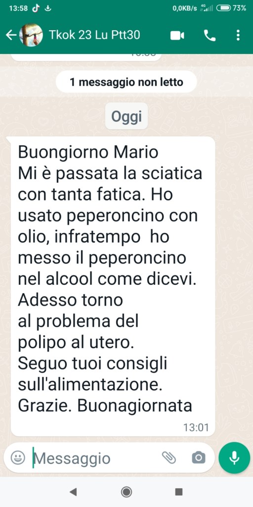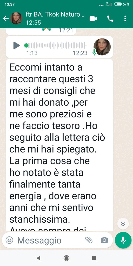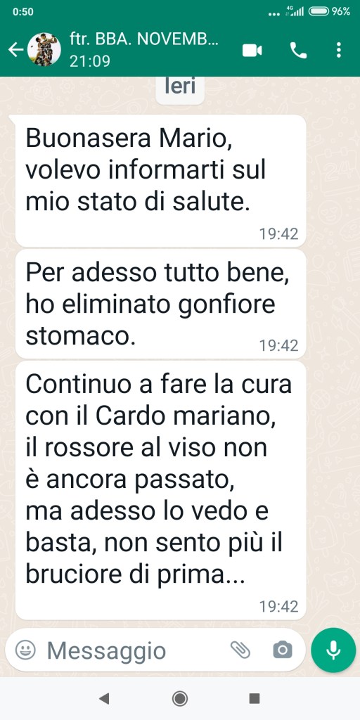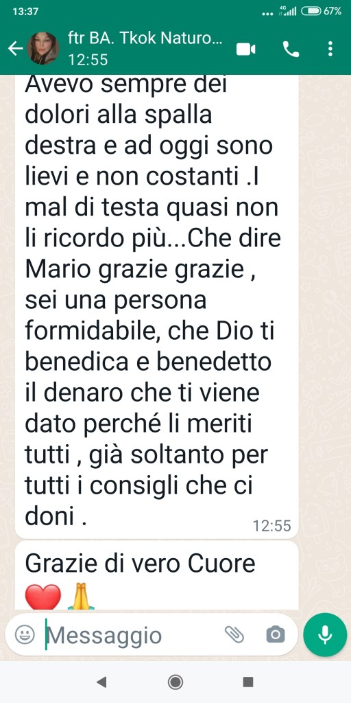 Eccomi intanto a raccontare questi 3 mesi di consigli che mi hai donato ,per me sono preziosi e ne faccio tesoro .Ho seguito alla lettera ciò che mi hai spiegato.La prima cosa che ho notato è stata finalmente tanta energia , dove erano anni che mi sentivo stanchissima. Avevo sempre dei dolori alla spalla destra e ad oggi sono lievi e non costanti .I mal di testa quasi non li ricordo più…Che dire Mario grazie grazie , sei una persona formidabile, che Dio ti benedica e benedetto il denaro che ti viene dato perché li meriti tutti , già soltanto per tutti i consigli che ci doni .