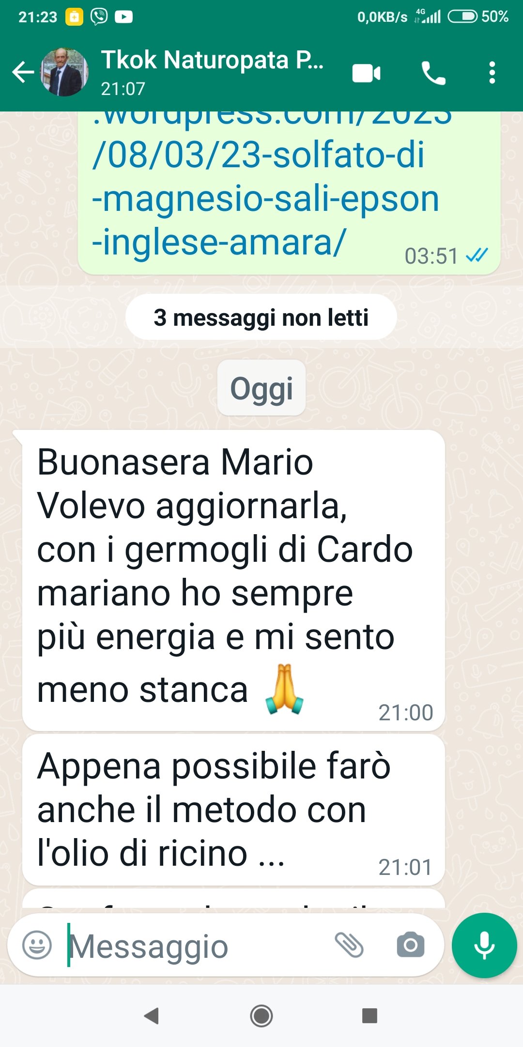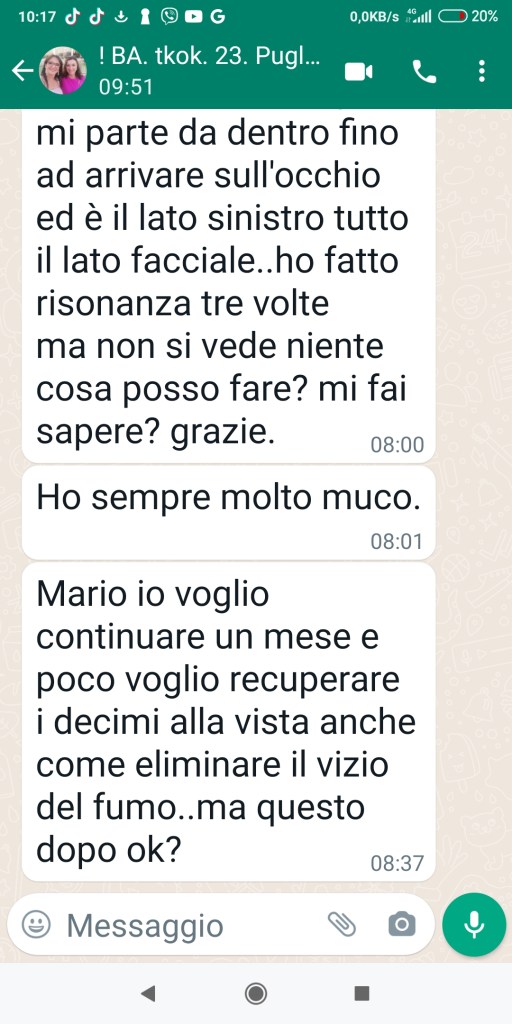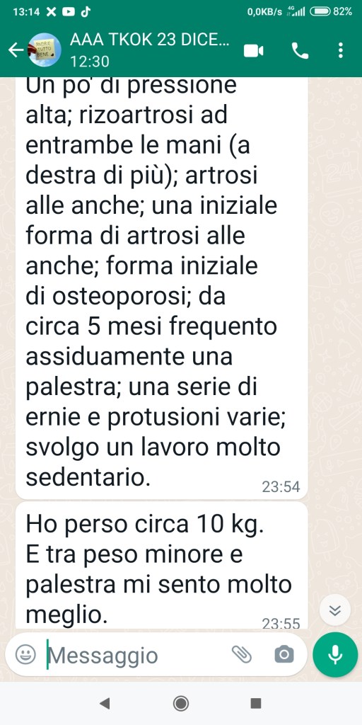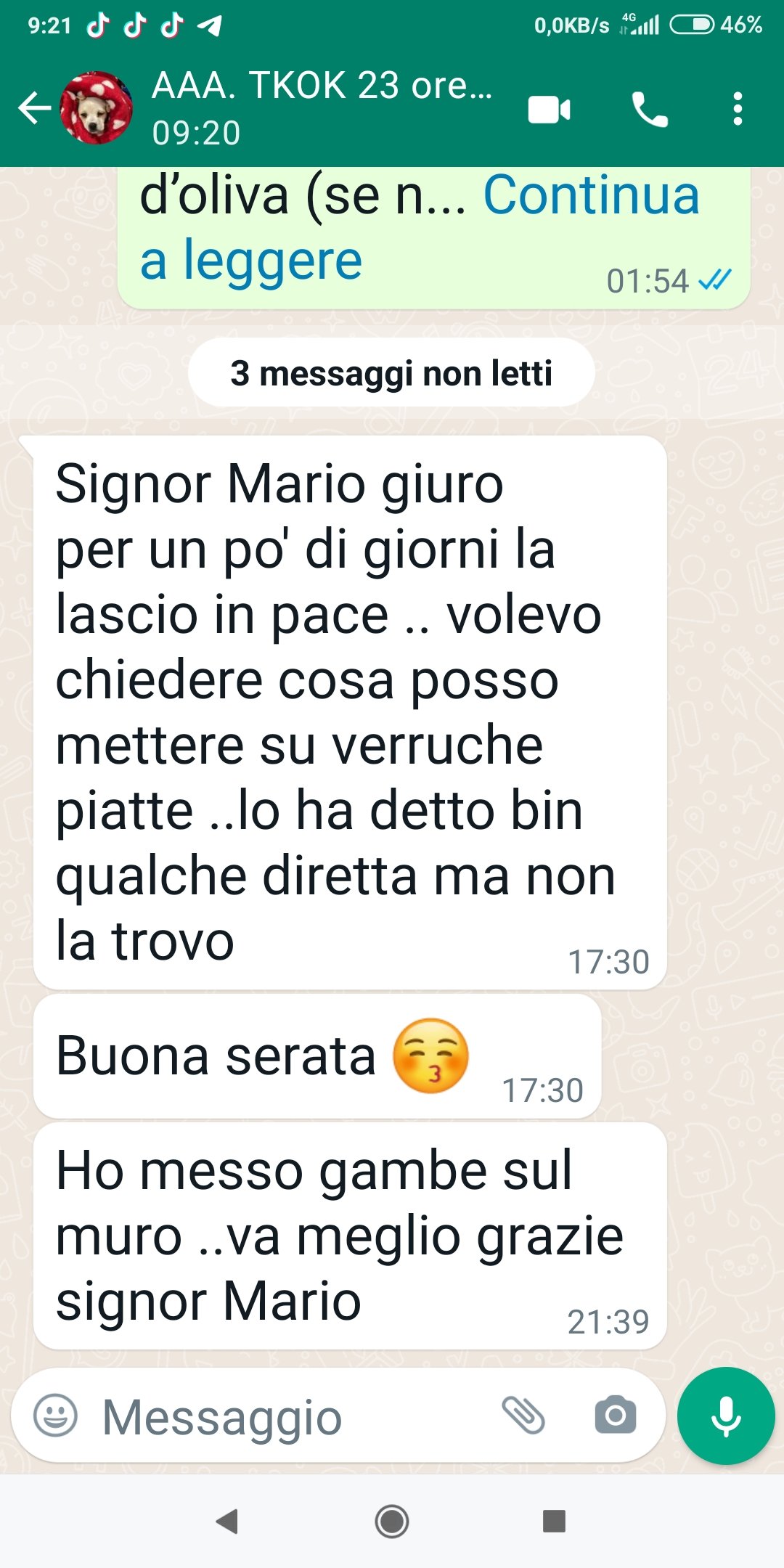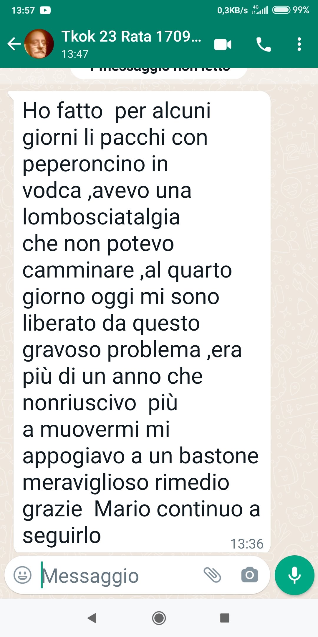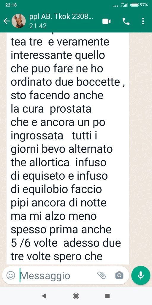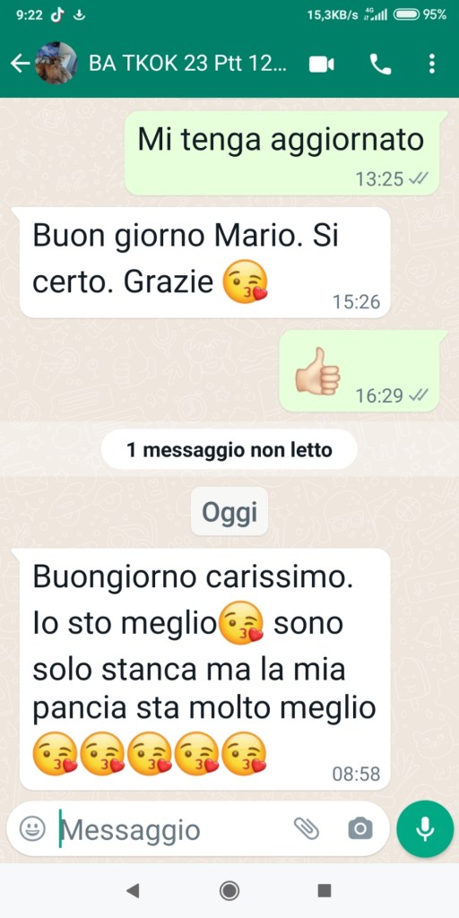 Eccomi intanto a raccontare questi 3 mesi di consigli che mi hai donato ,per me sono preziosi e ne faccio tesoro .Ho seguito alla lettera ciò che mi hai spiegato.La prima cosa che ho notato è stata finalmente tanta energia , dove erano anni che mi sentivo stanchissima. Avevo sempre dei dolori alla spalla destra e ad oggi sono lievi e non costanti .I mal di testa quasi non li ricordo più…Che dire Mario grazie grazie , sei una persona formidabile, che Dio ti benedica e benedetto il denaro che ti viene dato perché li meriti tutti , già soltanto per tutti i consigli che ci doni .