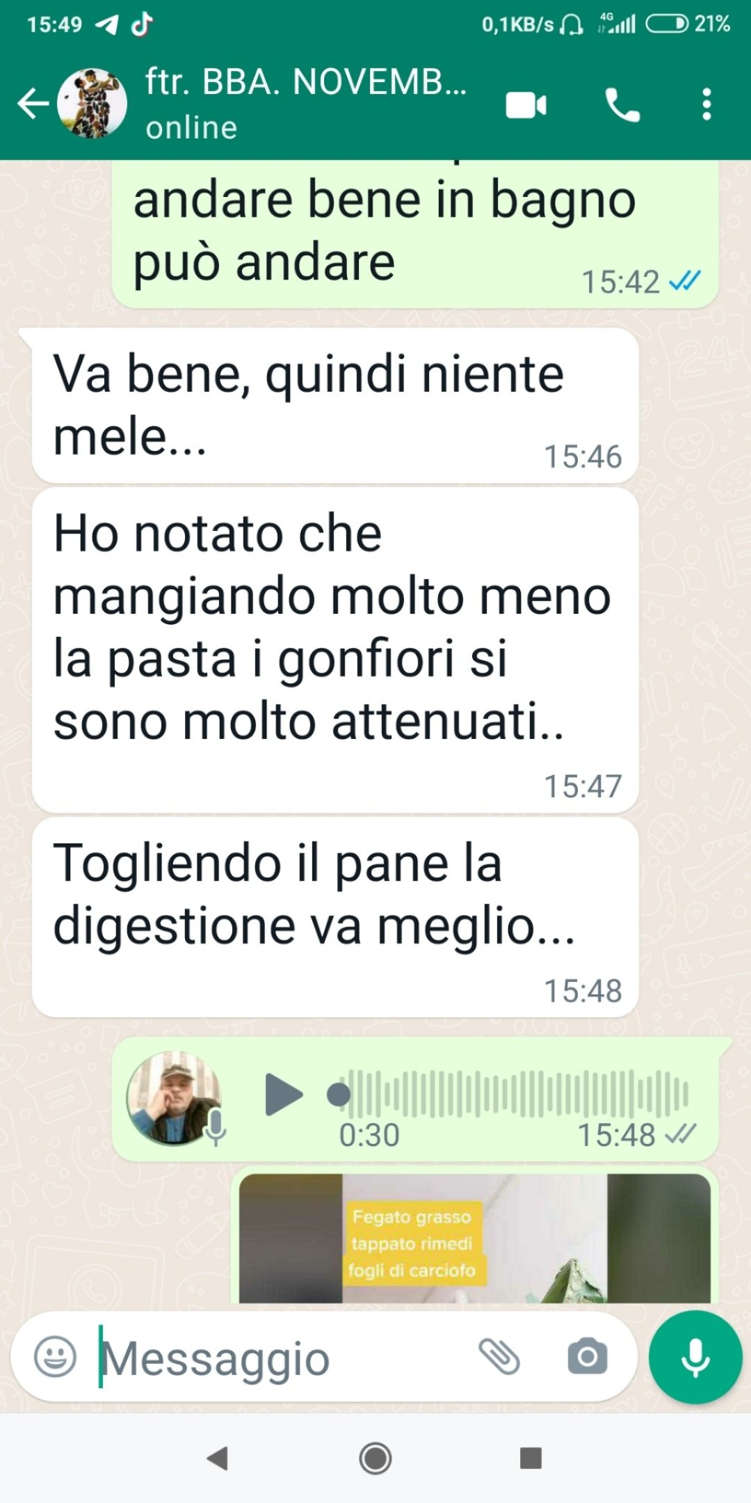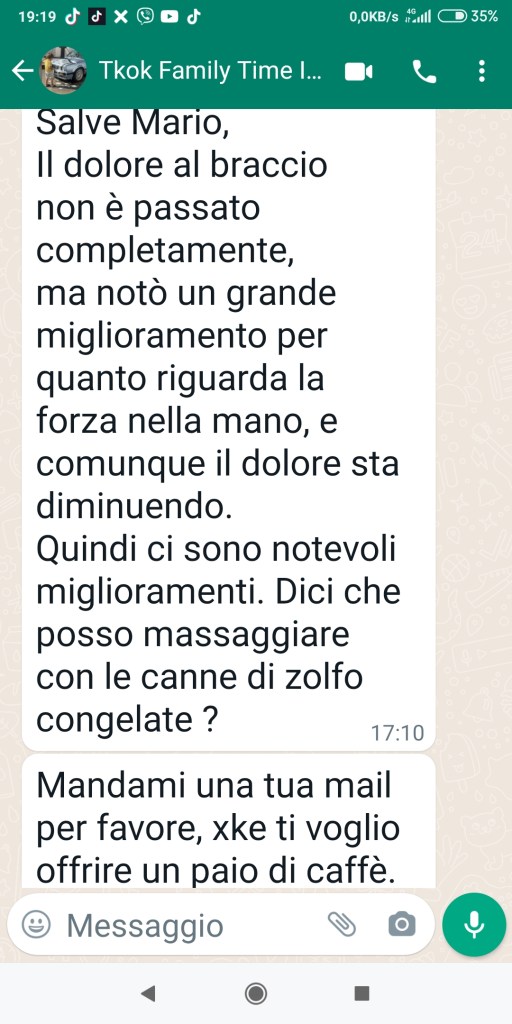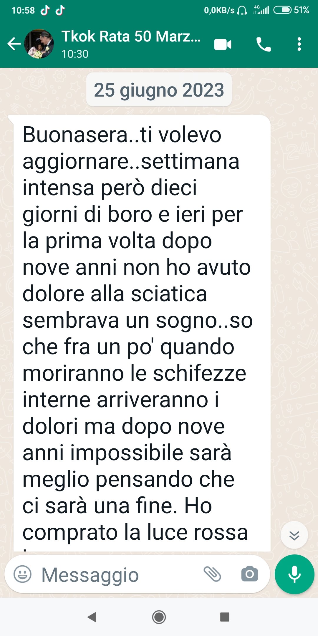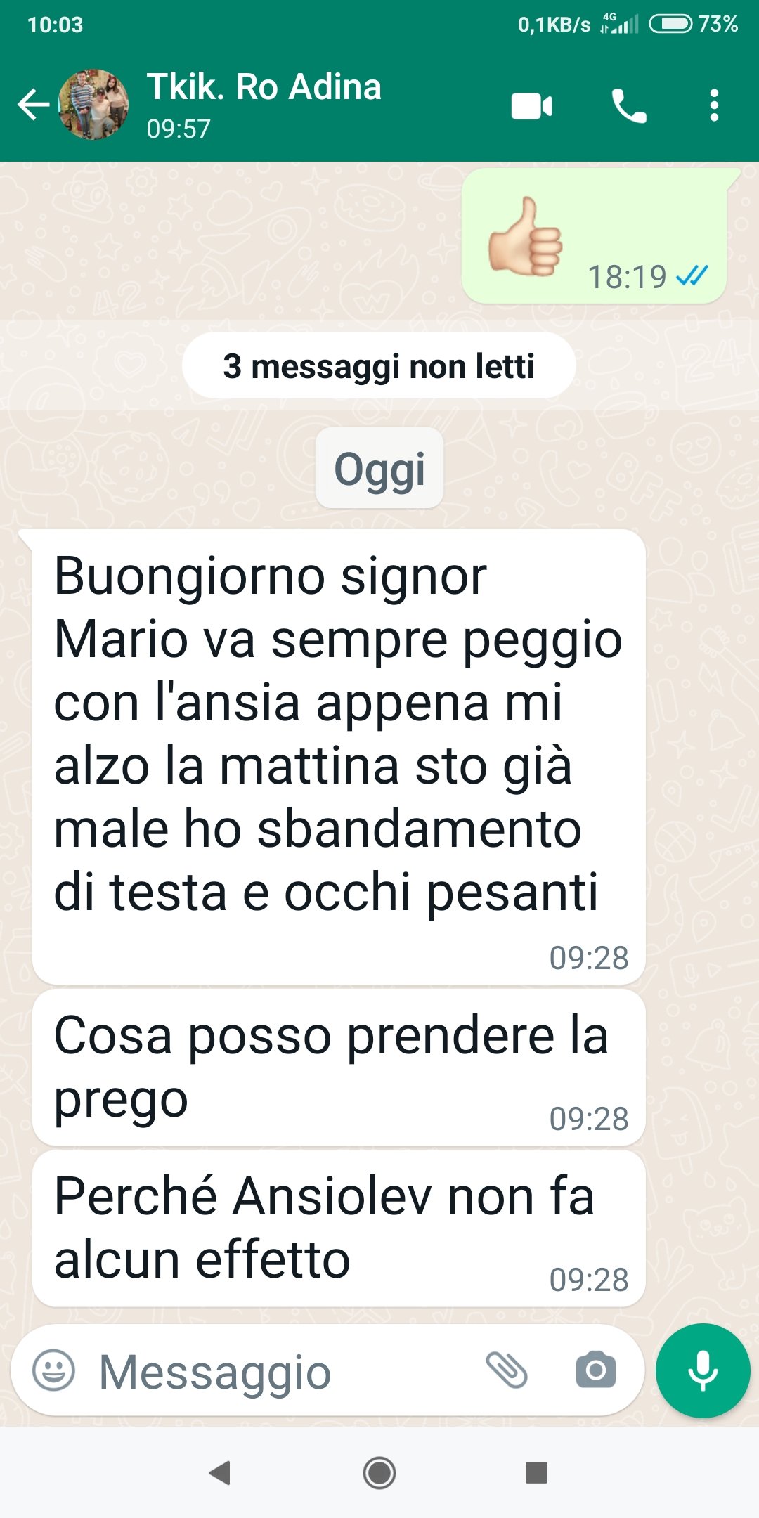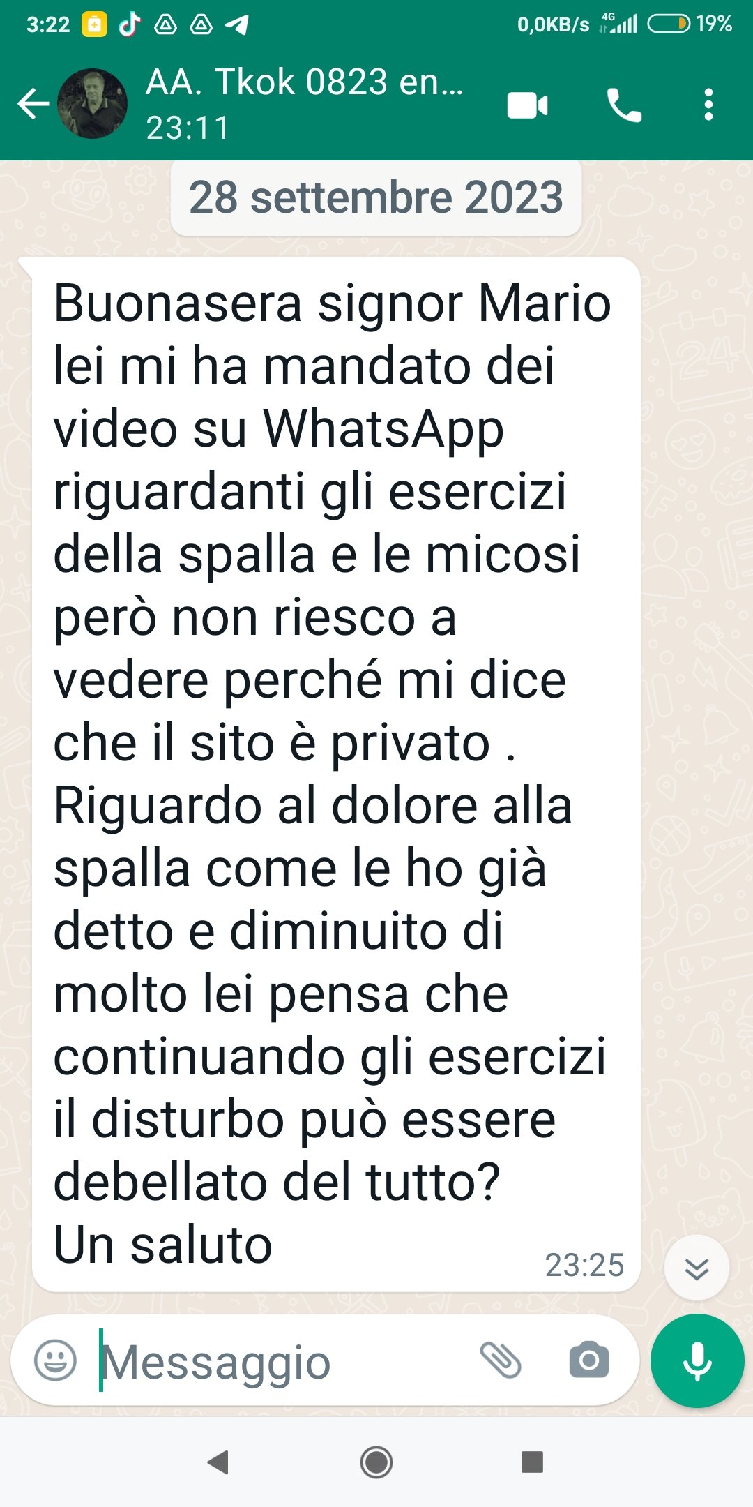 Eccomi intanto a raccontare questi 3 mesi di consigli che mi hai donato ,per me sono preziosi e ne faccio tesoro .Ho seguito alla lettera ciò che mi hai spiegato.La prima cosa che ho notato è stata finalmente tanta energia , dove erano anni che mi sentivo stanchissima. Avevo sempre dei dolori alla spalla destra e ad oggi sono lievi e non costanti .I mal di testa quasi non li ricordo più…Che dire Mario grazie grazie , sei una persona formidabile, che Dio ti benedica e benedetto il denaro che ti viene dato perché li meriti tutti , già soltanto per tutti i consigli che ci doni .