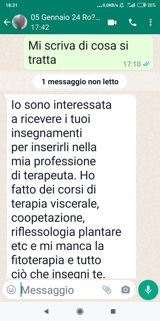 Io sono interessata a ricevere i tuoi insegnamenti per inserirli nella mia professione di terapeuta. Ho fatto dei corsi di terapia viscerale, coopetazione, riflessologia plantare etc e mi manca la fitoterapia e tutto ciò che insegni te. Quindi vorrei sapere se vuoi diventare il mio professore. Voglio che tu sappia che anche io volevo diventare una dottoressa e non sono riuscita ma adesso faccio terapie e trovo che un pochino il mio sogno sia avverato. Ti ringrazio moltissimo e spero che accetti la mia proposta. Tanti complimenti per tutto!!!