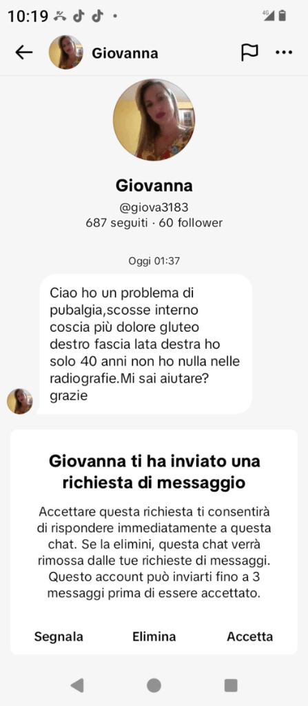 25b richieste. Pubalgia. scosse. interno. coscia. bacino.