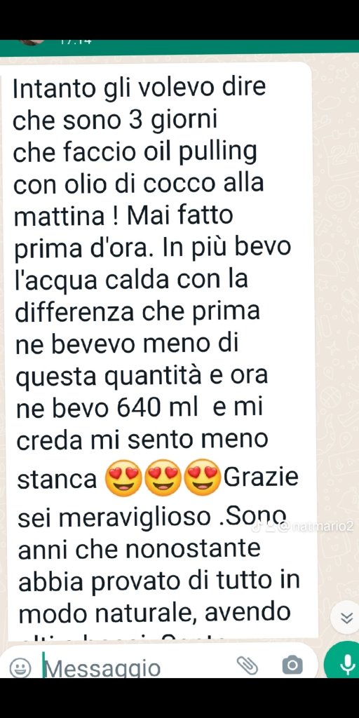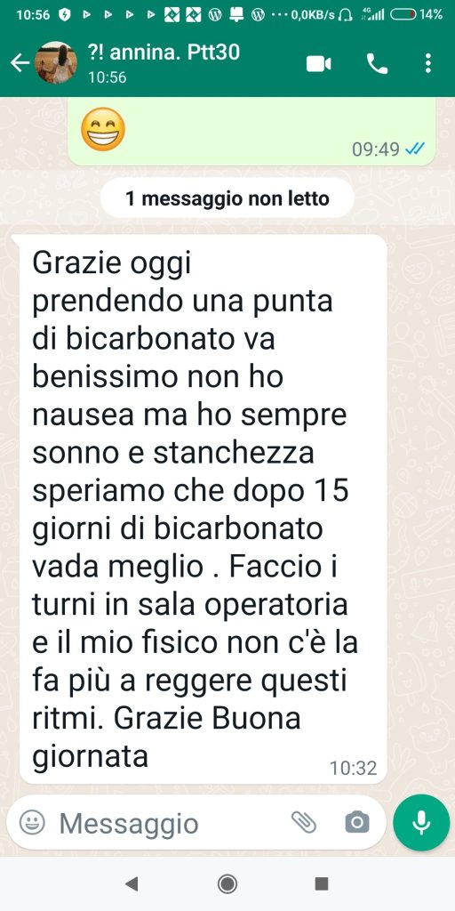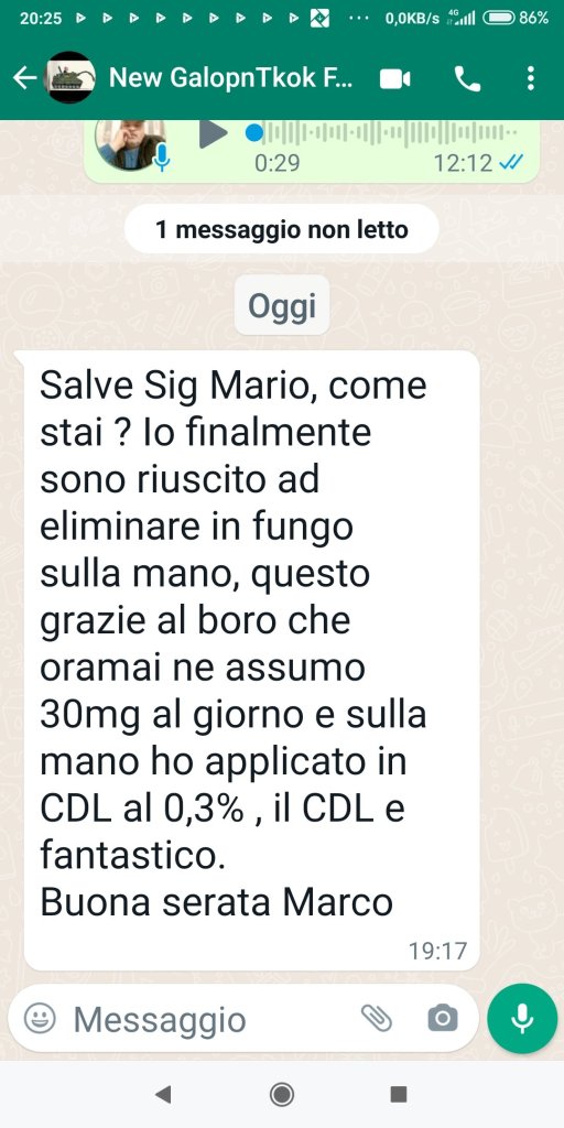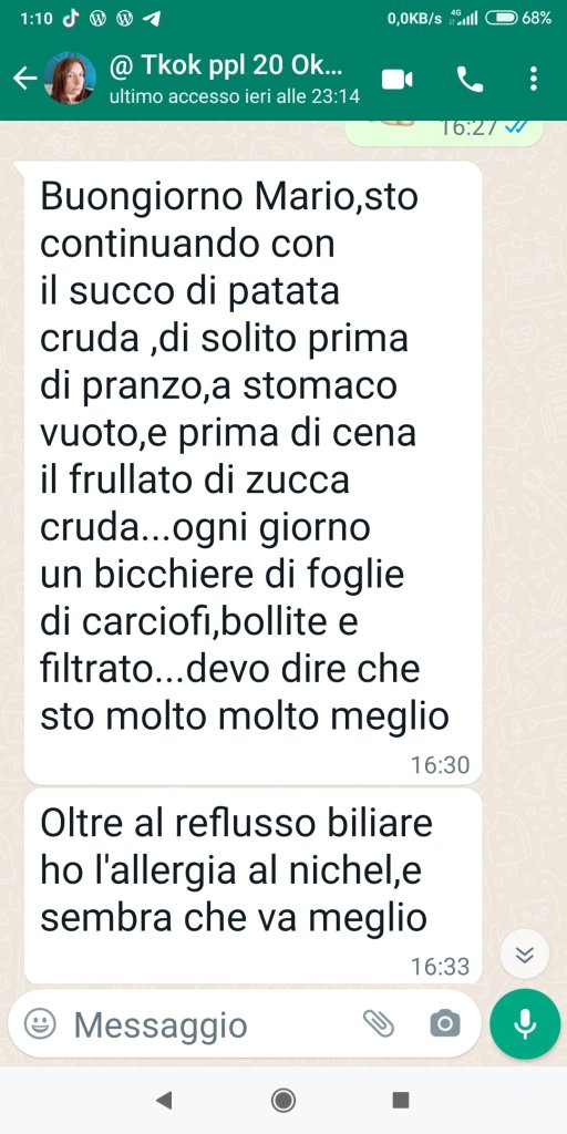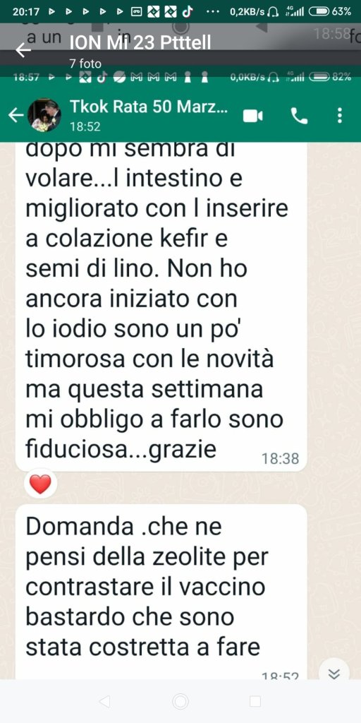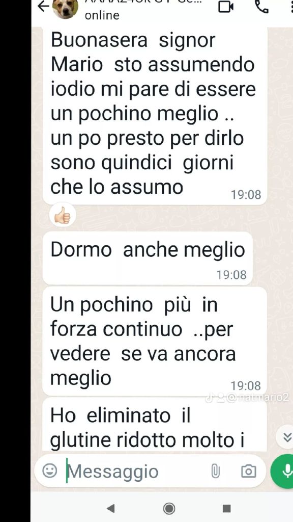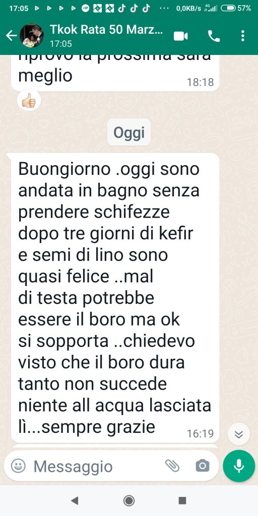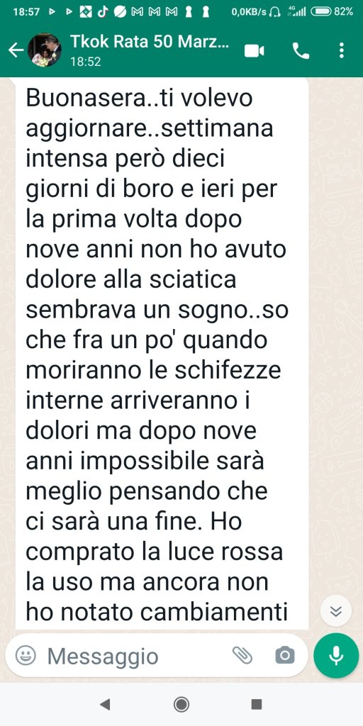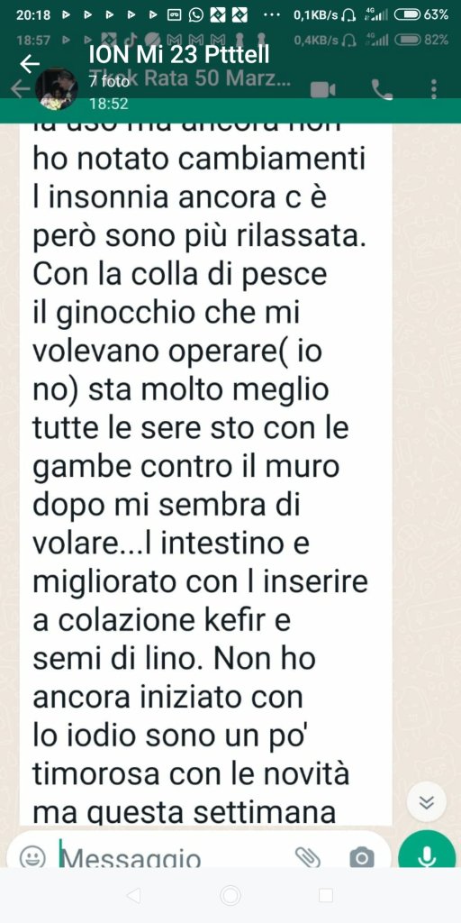 Buonasera..ti volevo aggiornare..settimana intensa però dieci giorni di boro e ieri per la prima volta dopo nove anni non ho avuto dolore alla sciatica sembrava un sogno..so che fra un po’ quando moriranno le schifezze interne arriveranno i dolori ma dopo nove anni impossibile sarà meglio pensando che ci sarà una fine. Ho comprato la luce rossa la uso ma ancora non ho notato cambiamenti l insonnia ancora c è però sono più rilassata. Con la colla di pesce il ginocchio che mi volevano operare( io no) sta molto meglio tutte le sere sto con le gambe contro il muro dopo mi sembra di volare…l intestino e migliorato con l inserire a colazione kefir e semi di lino. Non ho ancora iniziato con lo iodio sono un po’ timorosa con le novità ma questa settimana mi obbligo a farlo sono fiduciosa…grazie