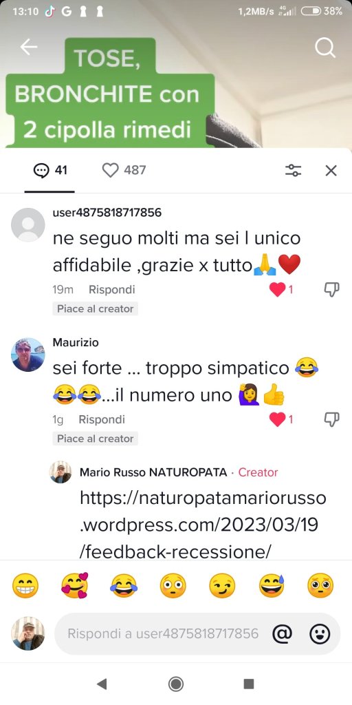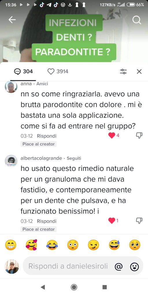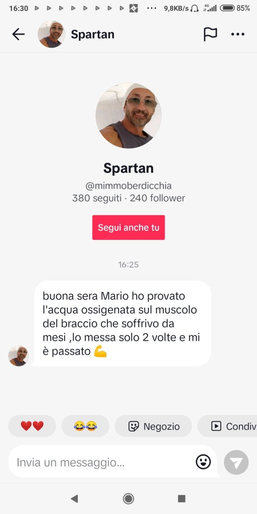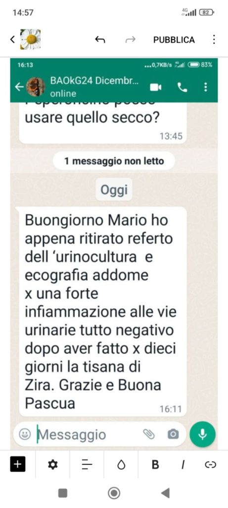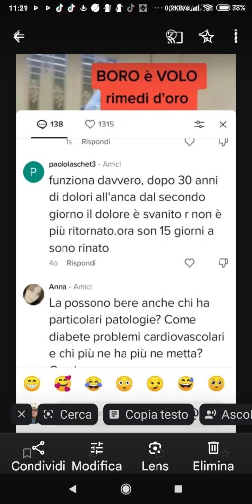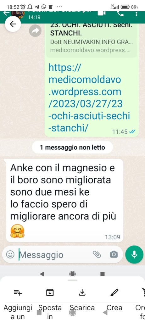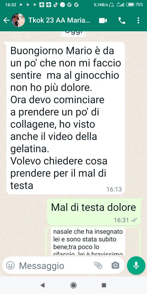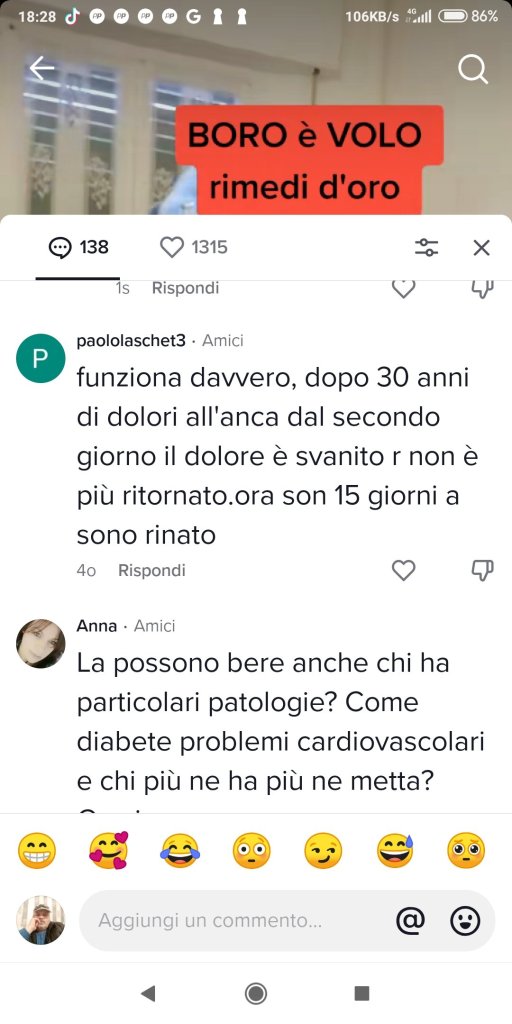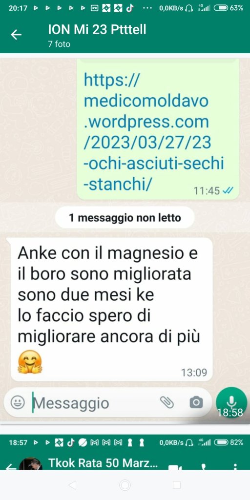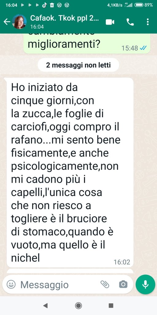Buonasera..ti volevo aggiornare..settimana intensa però dieci giorni di boro e ieri per la prima volta dopo nove anni non ho avuto dolore alla sciatica sembrava un sogno..so che fra un po’ quando moriranno le schifezze interne arriveranno i dolori ma dopo nove anni impossibile sarà meglio pensando che ci sarà una fine. Ho comprato la luce rossa la uso ma ancora non ho notato cambiamenti l insonnia ancora c è però sono più rilassata. Con la colla di pesce il ginocchio che mi volevano operare( io no) sta molto meglio tutte le sere sto con le gambe contro il muro dopo mi sembra di volare…l intestino e migliorato con l inserire a colazione kefir e semi di lino. Non ho ancora iniziato con lo iodio sono un po’ timorosa con le novità ma questa settimana mi obbligo a farlo sono fiduciosa…grazie