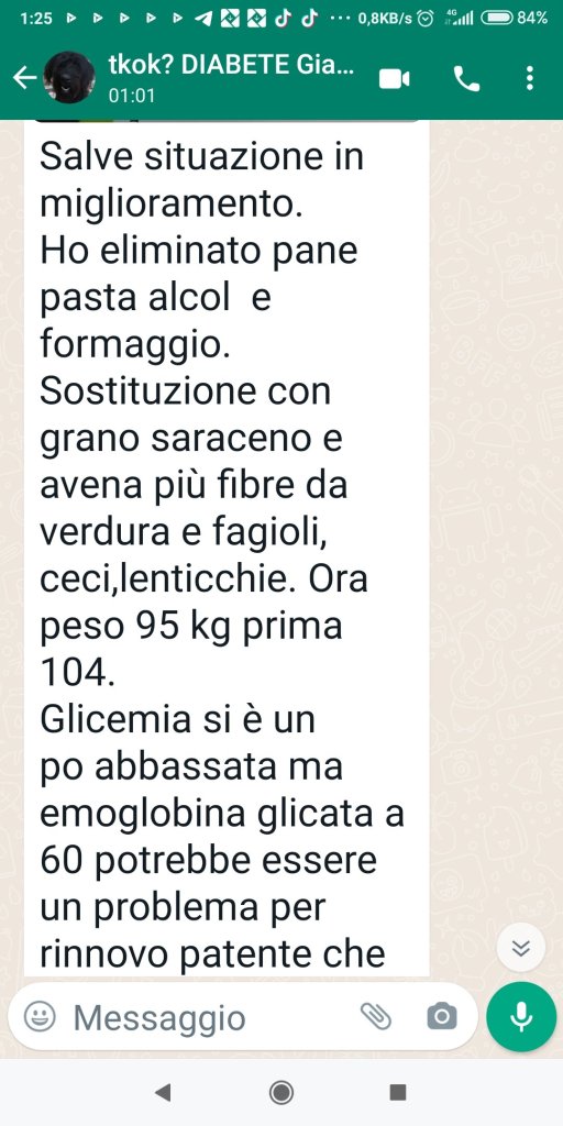 Buongiorno Mario, grazie per l’interessamento, la stanchezza è quasi sparita ed anche la pesantezza delle gambe, pressione stabilizzata 130/80. Il sonno è molto migliorato e l’ umore è migliorato. Rimangono gli episodi di cefalea e a glicemia sempre un po’ alta ~170; hai qualche rimedio per abbassarla stabilmente? (Non mangio dolci, vino e birra forse 1 volta x settimana)